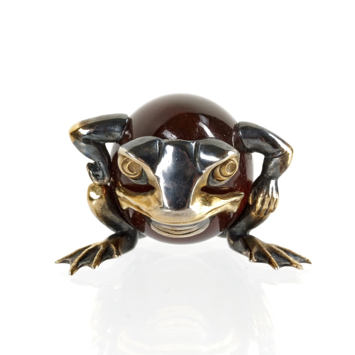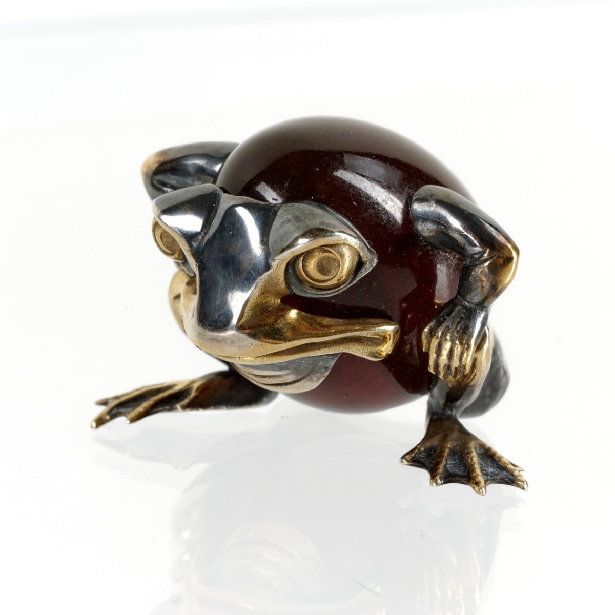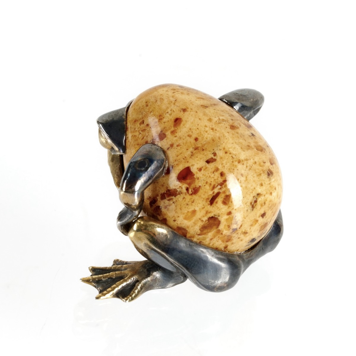Статуэтка в виде забавной лягушки изготовлена из серебра 925 пробы с элементами позолоты и чернения. Яйце образная вставка- формованный янтарь.