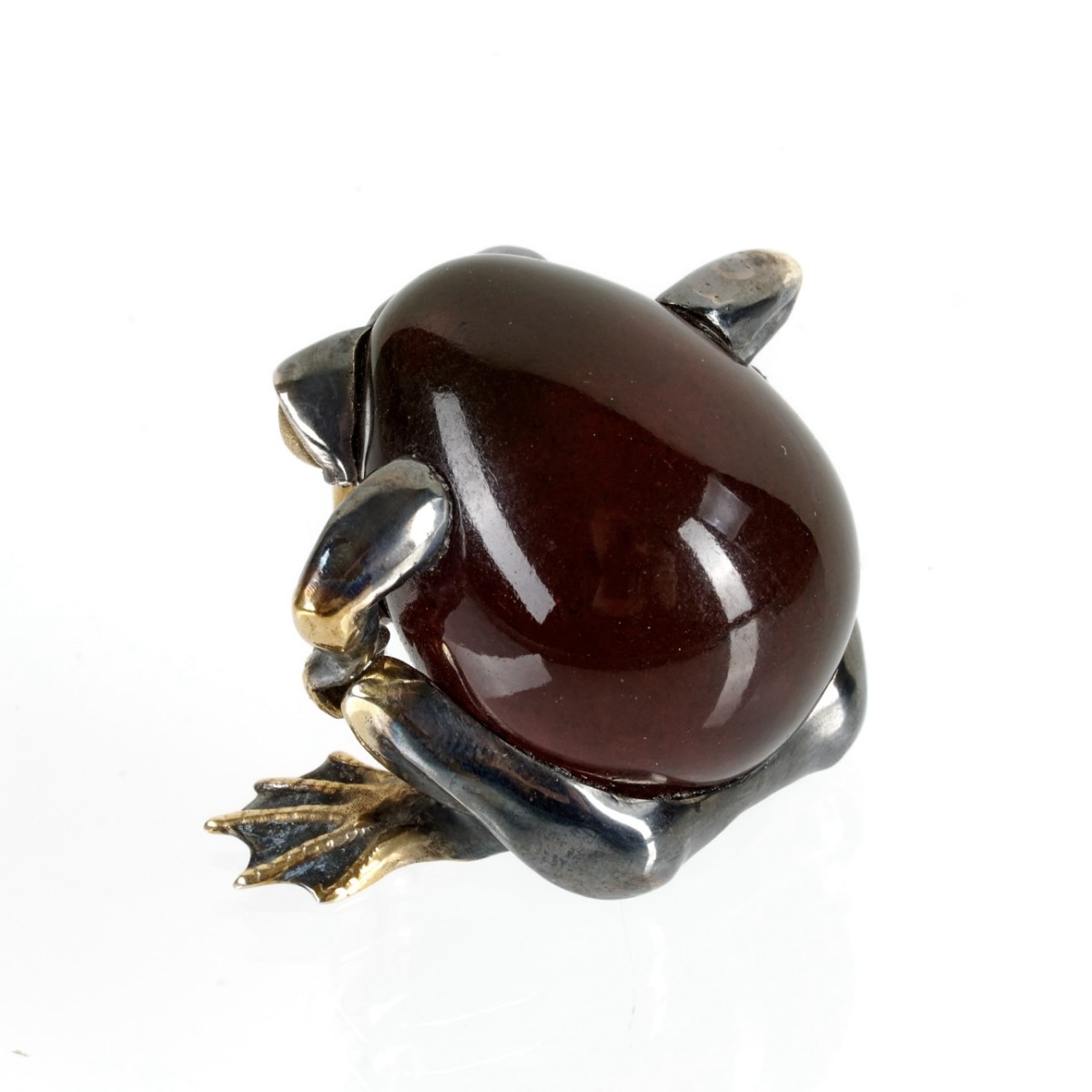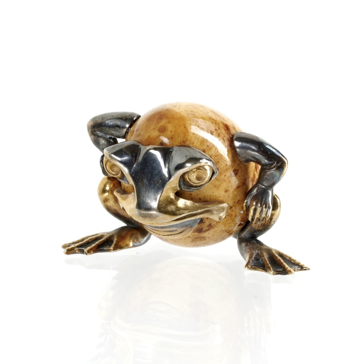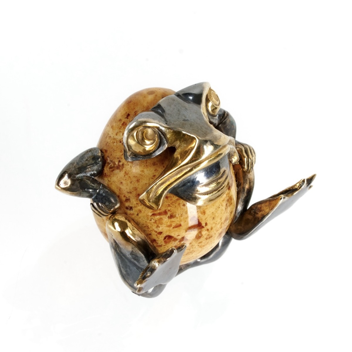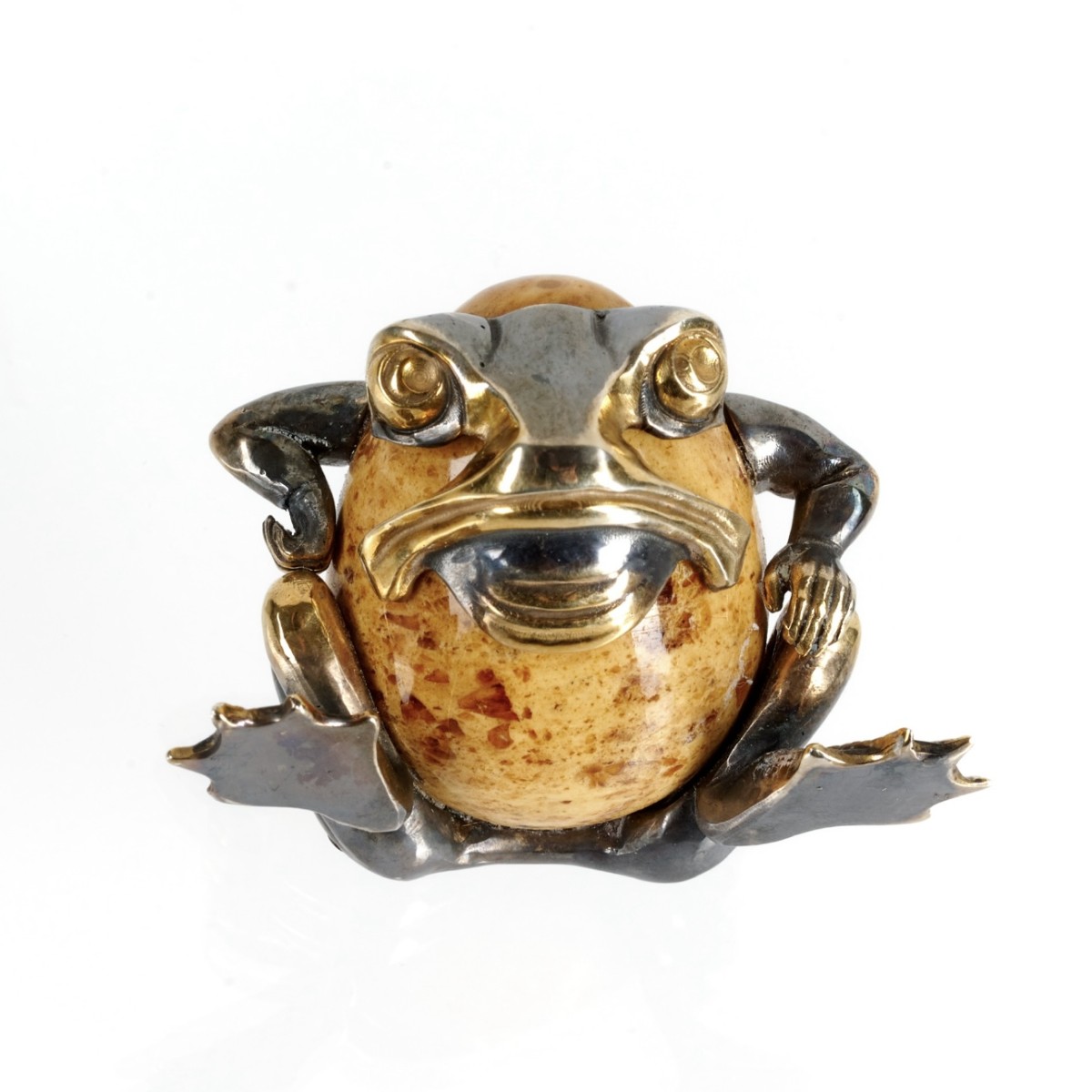 Статуэтка в виде забавной лягушки изготовлена из серебра 925 пробы с элементами позолоты и чернения. Яйце образная вставка- формованный янтарь.