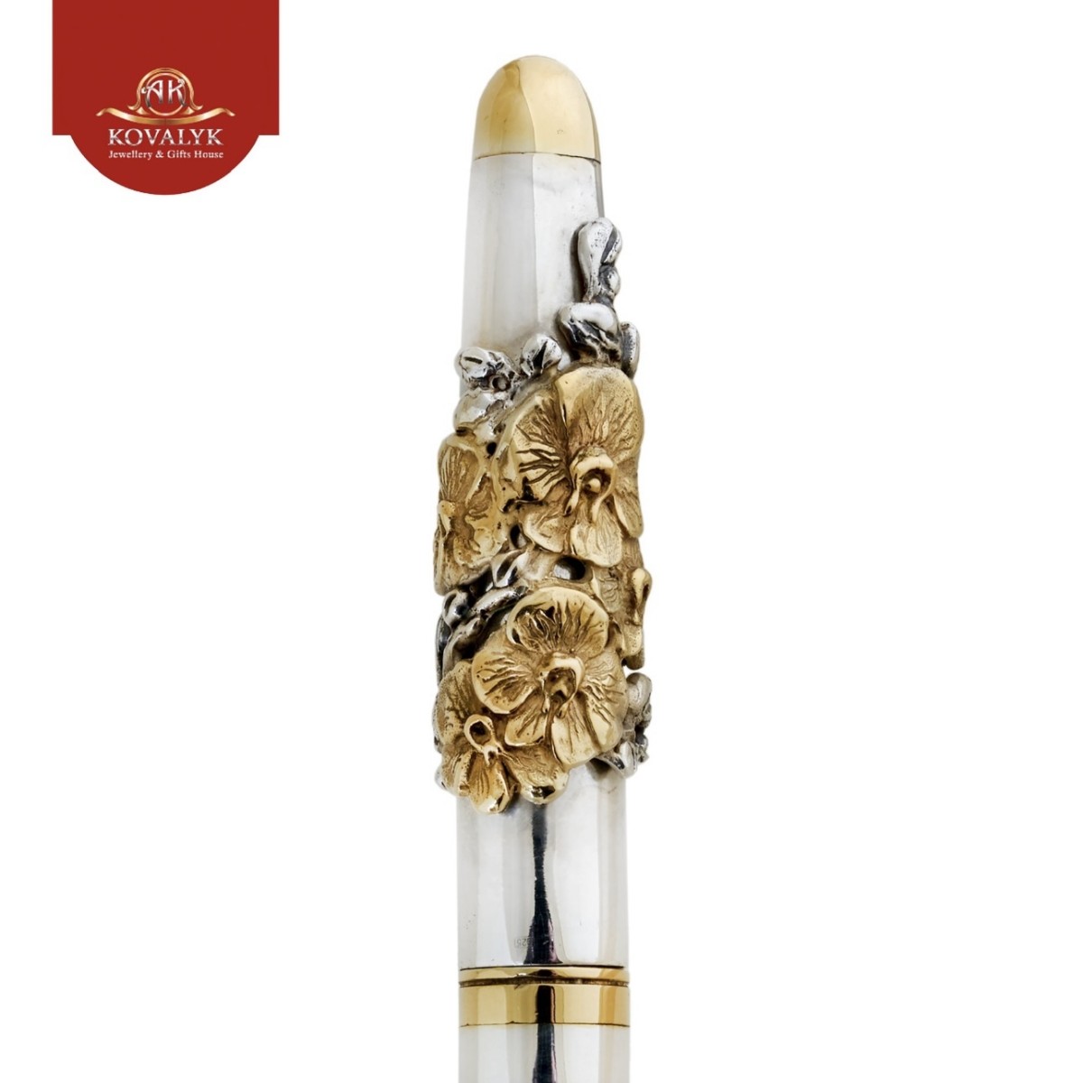 Женская шариковая ручка с изображением нежных цветов Виол изготовлена из серебра 925 пробы с элементами позолоты и чернения. Лаконичный дизайн и выдвижной механизм делают ее удобной в ежедневном использовании. Простота и утонченность этого изделия не оставит равнодушной любую женщину!