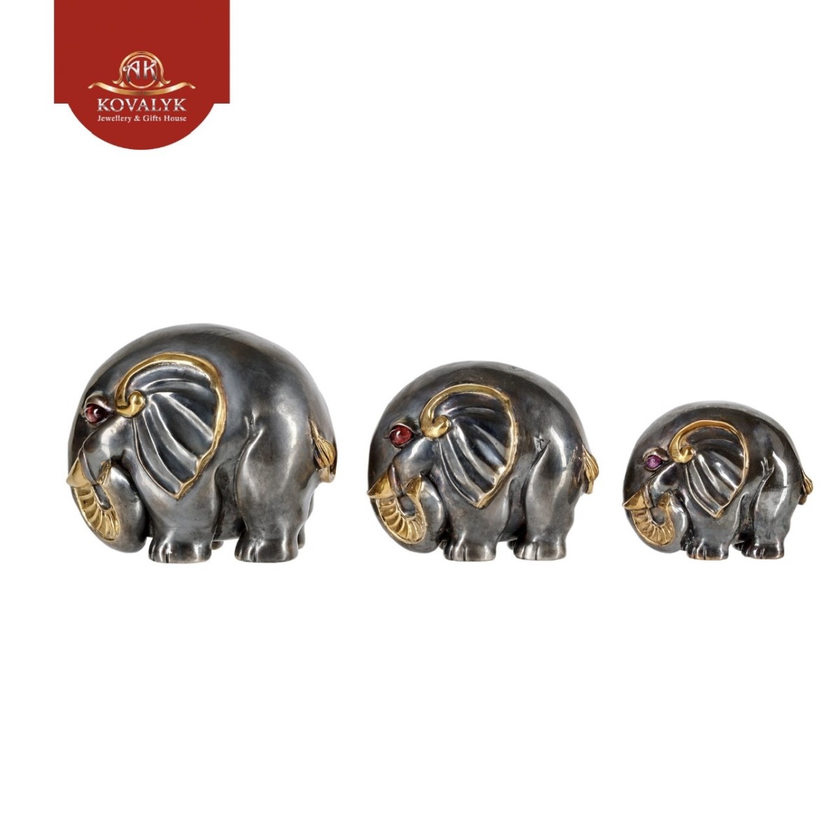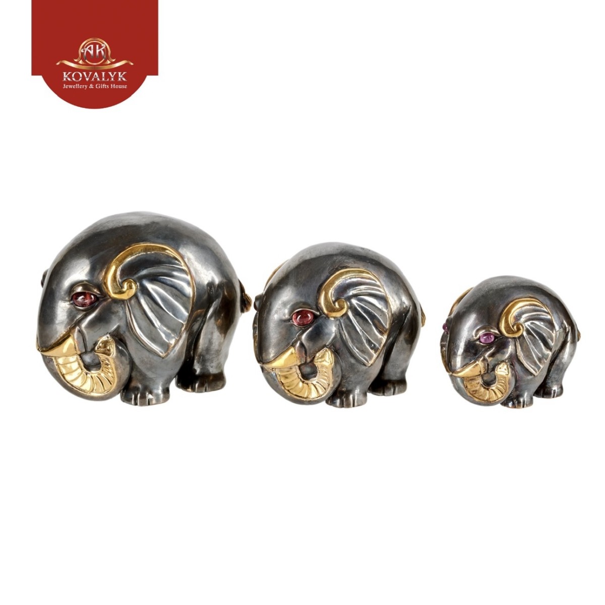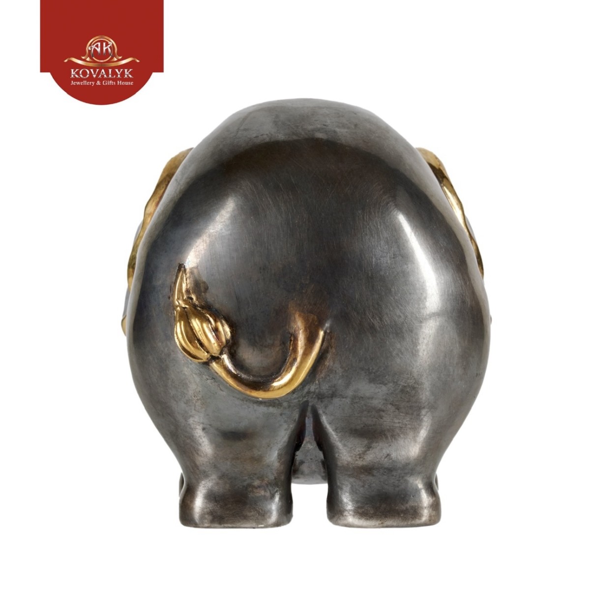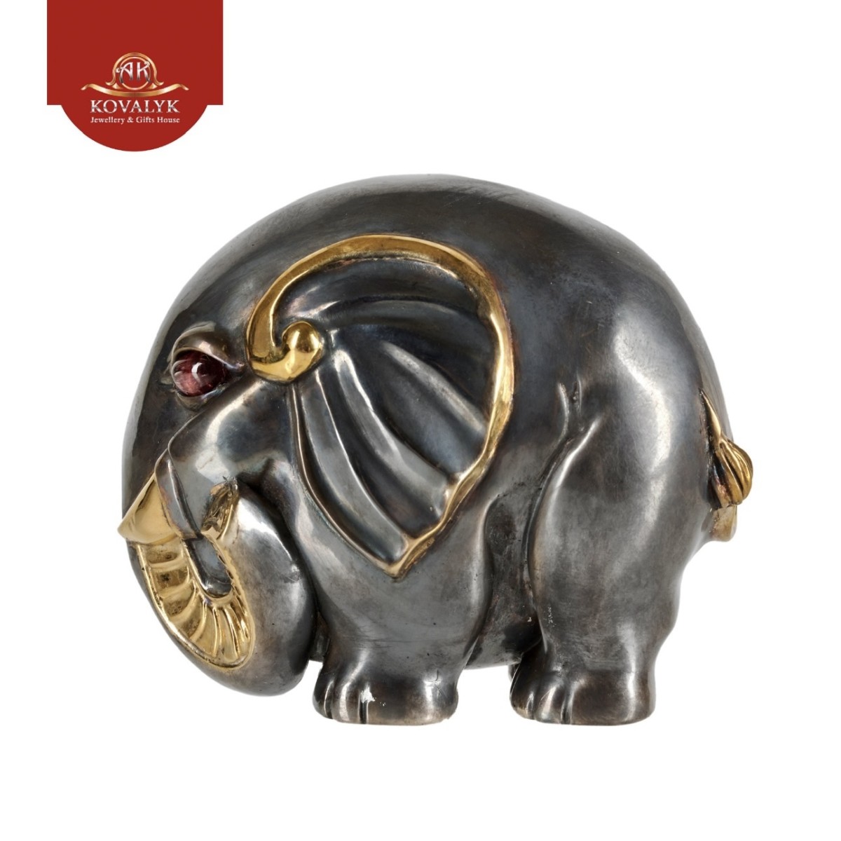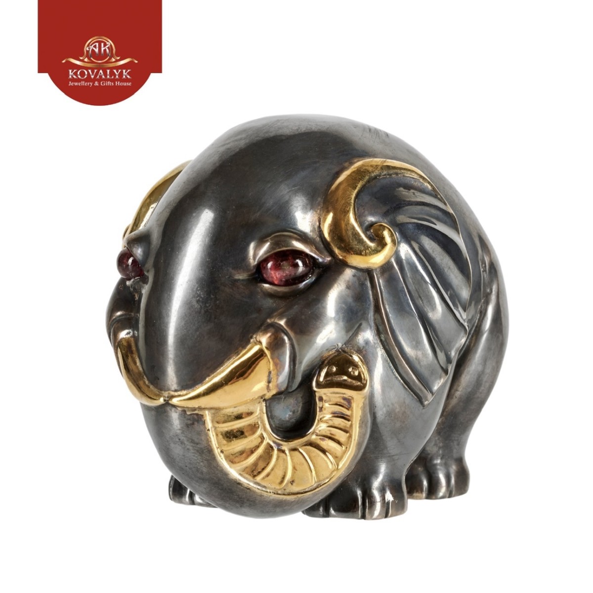 Статуэтка в виде потешного слоника изготовлена из серебра 925 пробы с элементами позолоты и чернения.