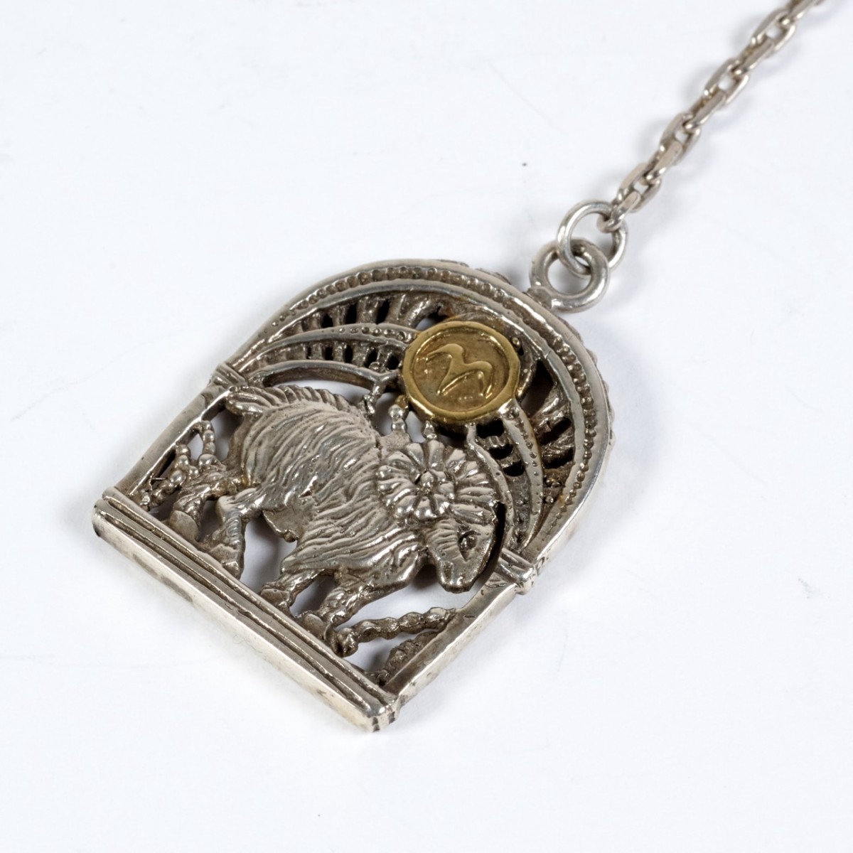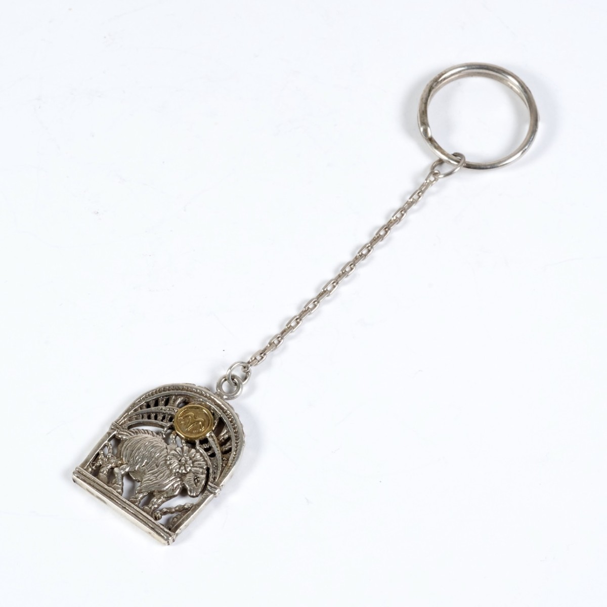 Утонченный брелок с изображением знака зодиака Овен изготовлен из серебра с элементами позолоты и чернения.